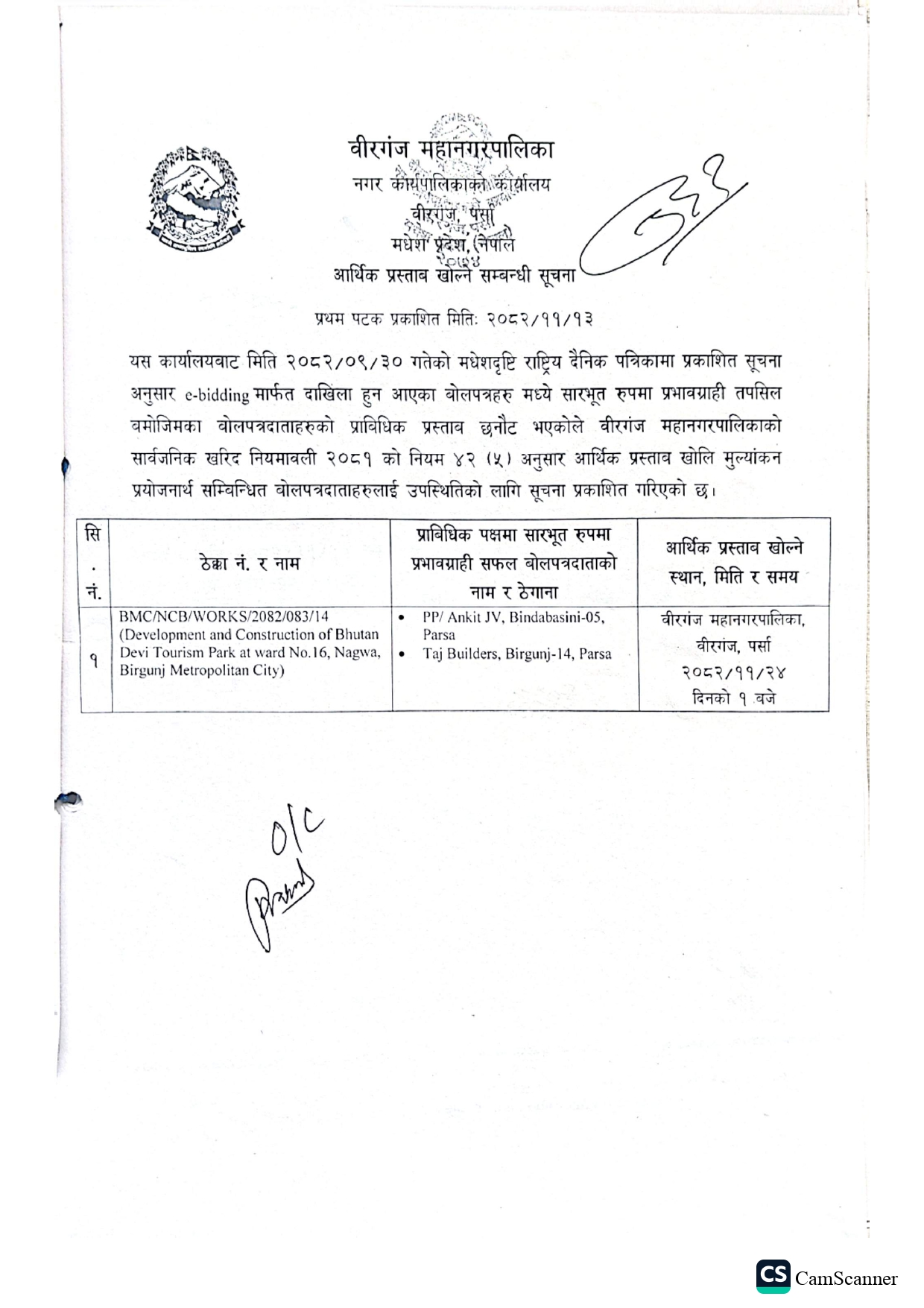 आर्थिक प्रस्ताव खोल्ने सम्बन्धि सूचना