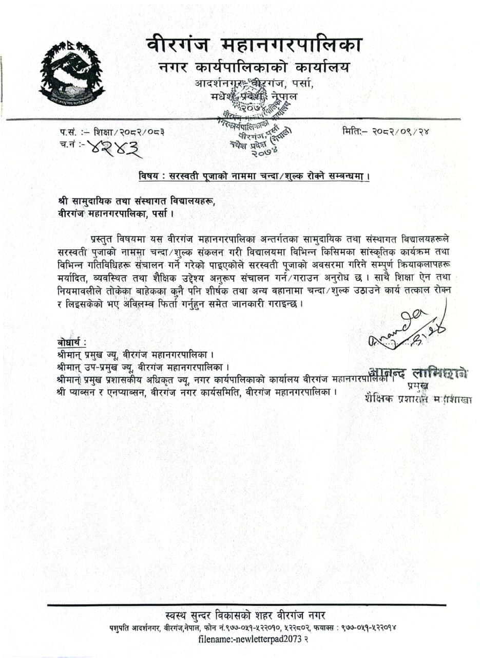 » सरस्वती पुजाको नाममा चन्दा/शुल्क रोक्ने सम्बन्धि सूचना
